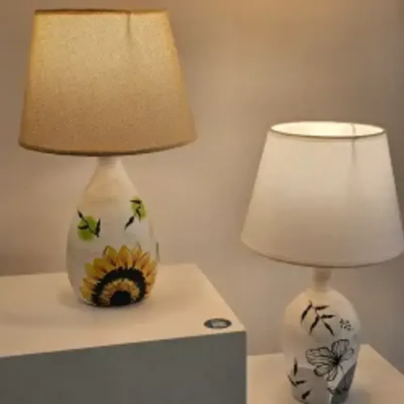 Luminaria de mesa con base cerámica y pantalla en textil plastificado
