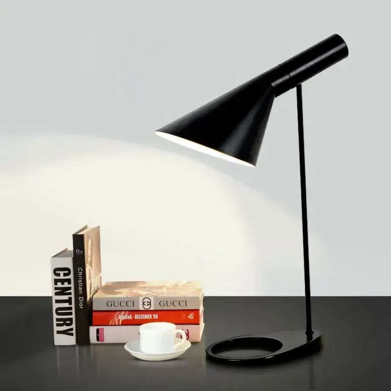 Luminaria de mesa AJ, diseño de Arne Jacobsen, en metal negro, iluminación con un socket E27