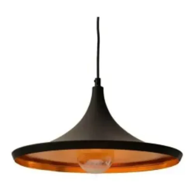 Luminaria colgante Beat Wide, en metal negro y dorado. Forma parte del conjunto Beat del diseñador Tom Dixon
