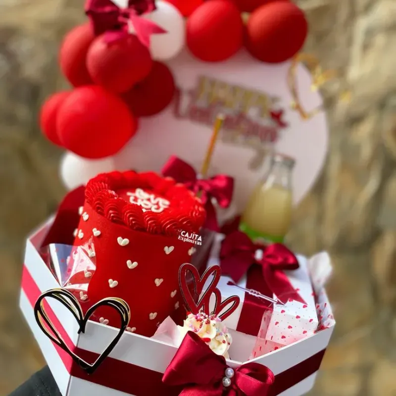 Bandeja exagonal decorada para la ocasion que incluye un mini cake✅️ una caja pequeña rellena de mini donas ✅️ 5 confituras ✅️ dos jugos✅️