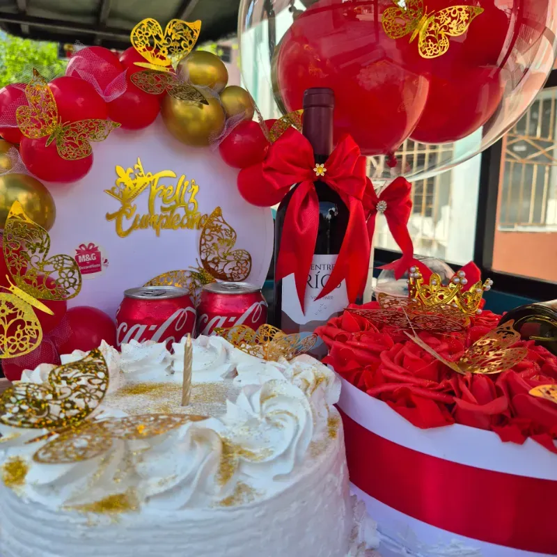 Bandeja sorpresa rellena de Un mini cake Un bucket de rosas eternas Un perfume una botella de vino Dos coca cola un dulce (ya sea vaso domo tres leches, cuña tres leches o un carlota de limon) Decoracion a gusto del cliente un pulover personalizado