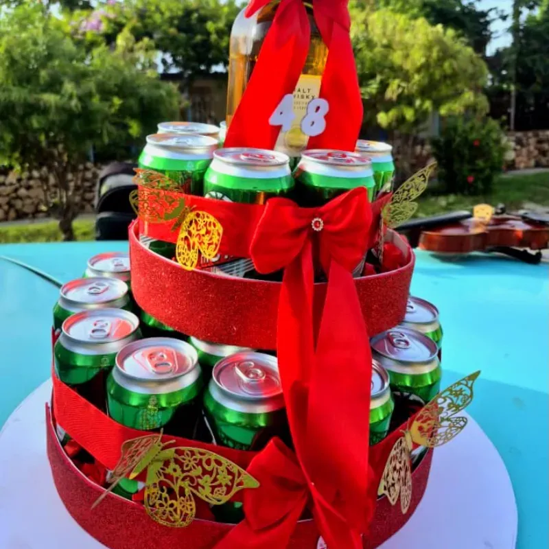 Montaña de dos pisos de una caja de cerveza ( ya sea cristal o bucanero) y una botella de ron ademas de accesorios para decoracion ✅️