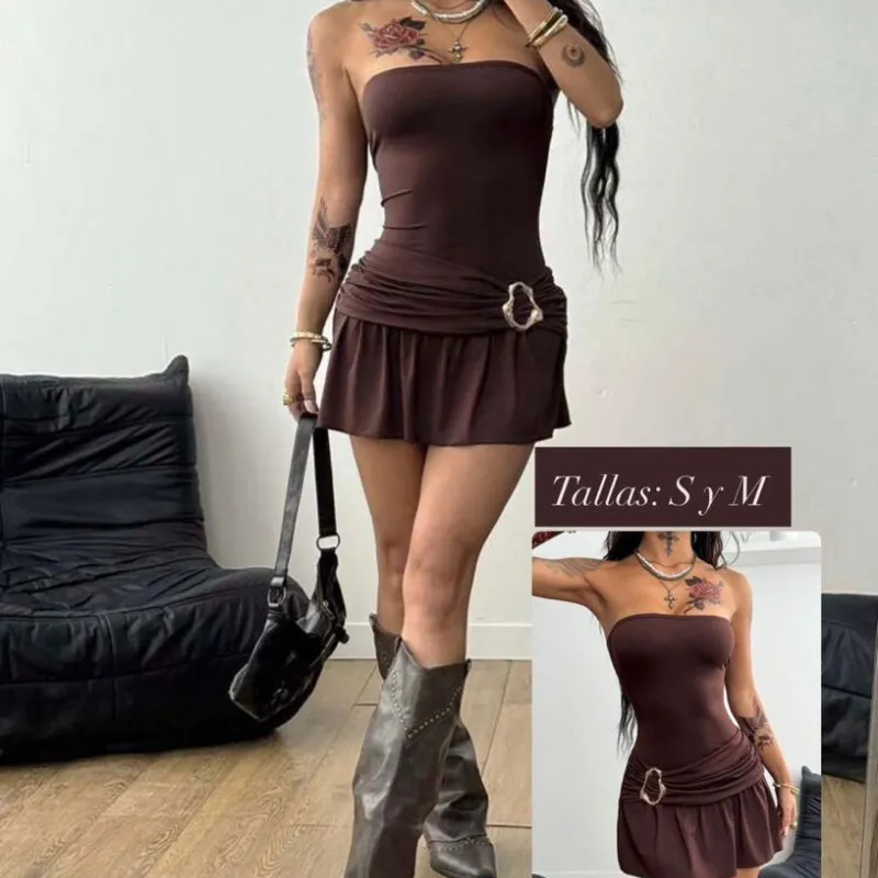 Vestido corto carmelita con detalle dorado