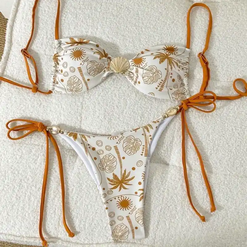 Bikini beige y naranja de palmas