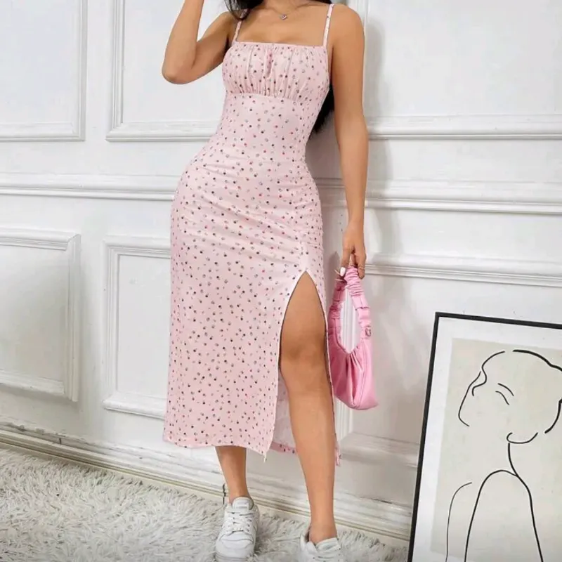 Vestido rosa ,busto fruncido ,apertura en la pierna