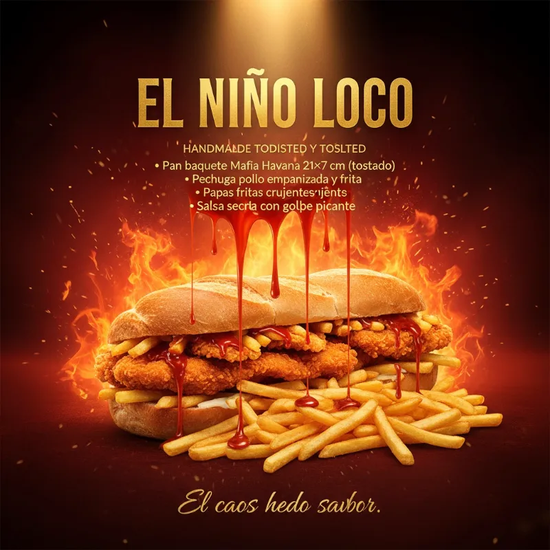 Él no teme al fuego; lo provoca. Lo llaman El Niño Loco porque donde pisa, reina el caos. Ríe cuando todos corren, baila entre las llamas, y su comida lleva su misma locura. Pollo crujiente, prensado y envuelto en hotdog bun, con papa fritas y una salsa secreta que parece inofensiva... hasta que llega el golpe de picante. Un ardor salvaje, irresistible, que hace llorar y sonreír al mismo tiempo. Es el sabor de la locura: ardiente, impredecible y peligrosamente delicioso.