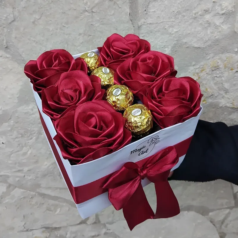 Caja cuadrada 6 rosada eternas (colores a su preferencia según disponibilidad) 4 Bombones Ferrero Rocher (disponible con otros bombones más económicos)