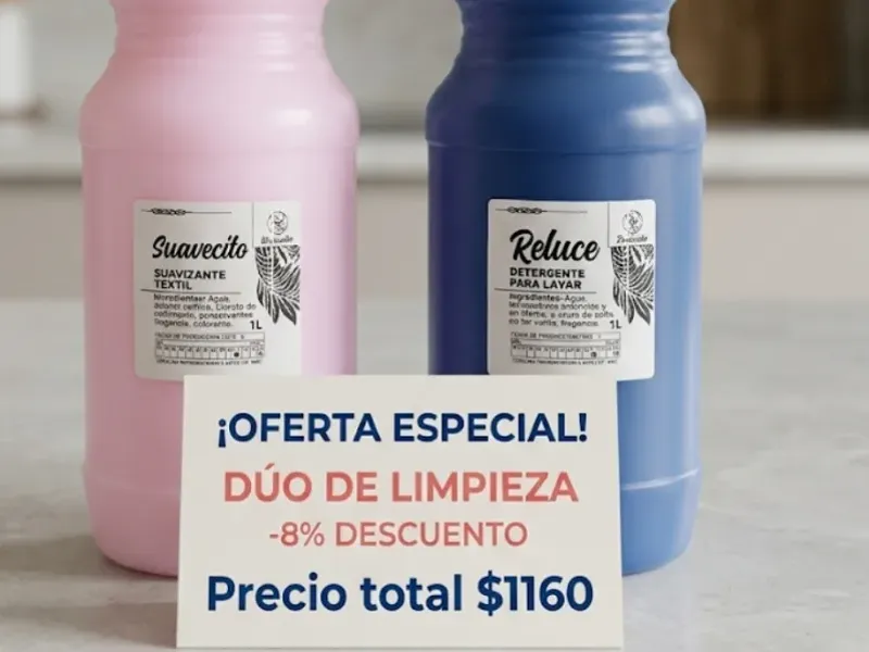 ¡Aproveche por días limitados el combo de limpieza que su ropa necesita! Lleva el Suavizante textil Suavecito de 1L, que deja sus prendas increíblemente suaves y con una fragancia duradera, junto al potente Detergente Reluce, ideal para eliminar manchas difíciles y mantener los colores vivos. Por tiempo limitado, este dúo indispensable tiene un descuento especial que no podrás encontrar en cualquier momento. Dele a su familia la frescura y suavidad que se merecen, ¡pero apúrense, porque esta oferta TERMINA PRONTO!