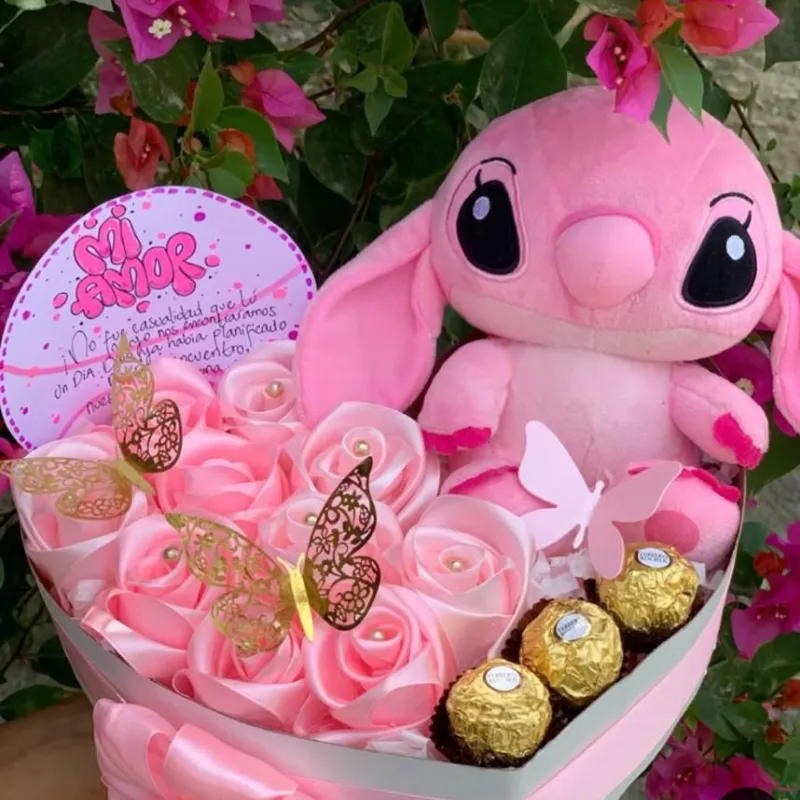 Caja de corazón ❤️, peluche , rosas 🌹 y bombones Ferrero Rocher