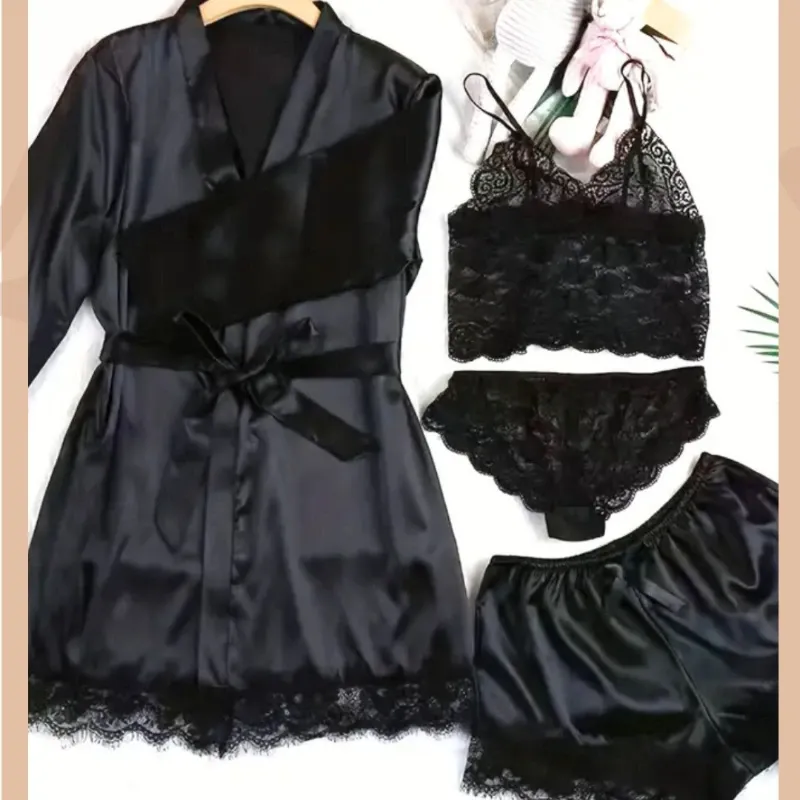 Hermoso y funcional Set de pijama de 4 piezas, negro. Incluye bata
