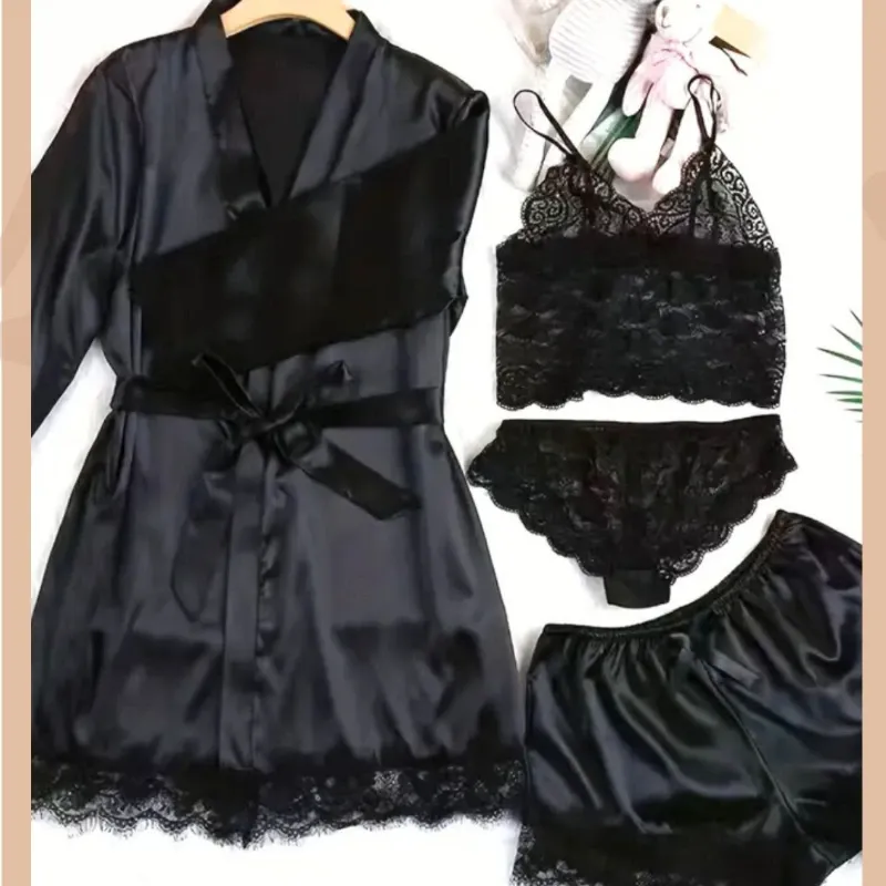 Hermoso, cómodo y sexy set de pijama negro, de 4 piezas. Incluye: pijama, braga de encaje y bata satinada