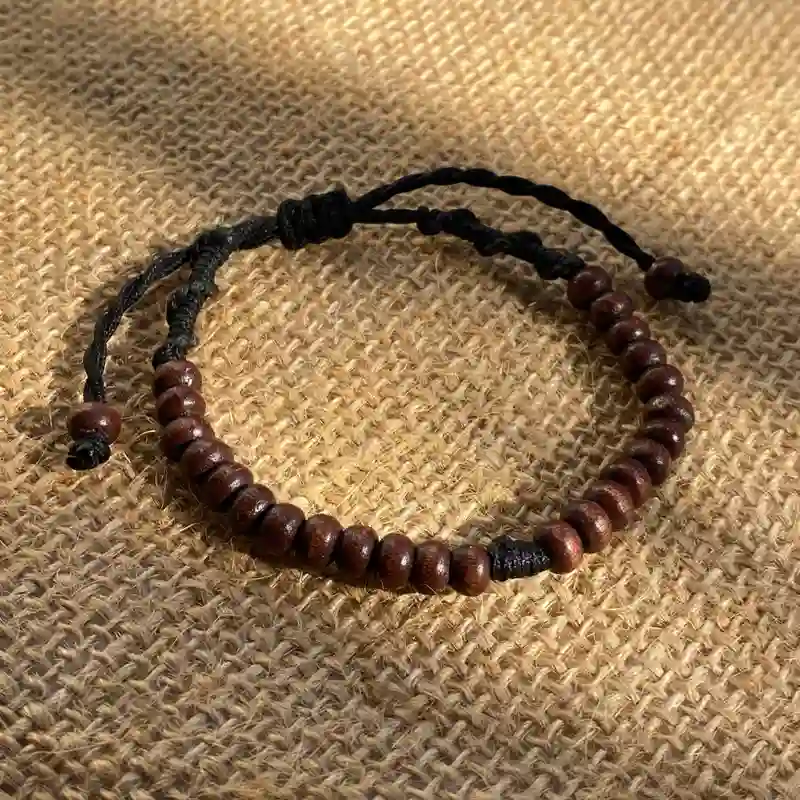 Hecha a mano con cuentas de madera natural y tejido artesanal.