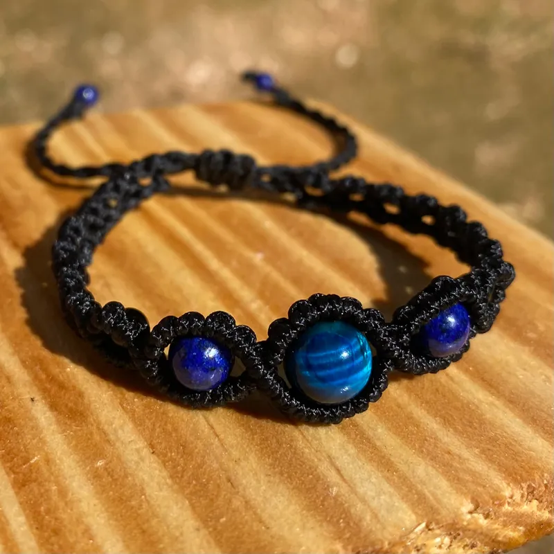 Pulsera de ojo de halcón y lapislázuli, combinación que une visión, intuición y comunicación consciente. El ojo de halcón aporta claridad mental y perspectiva para ver más allá, mientras el lapislázuli estimula la expresión auténtica y la sabiduría interior. Un amuleto de enfoque y verdad.