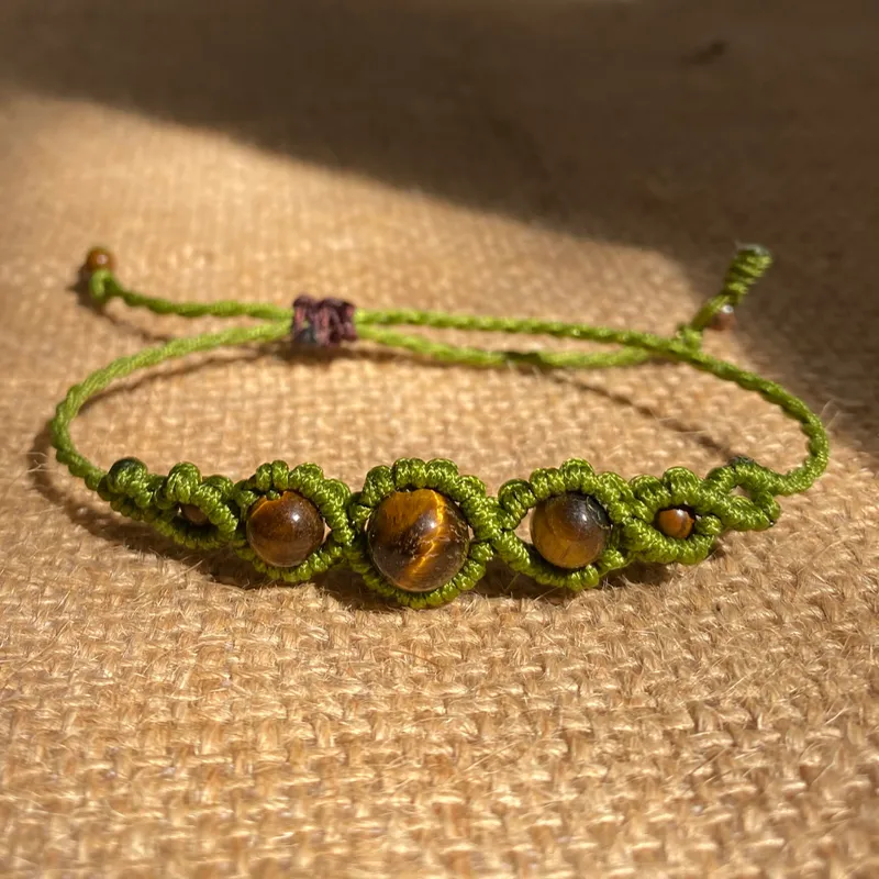 Pulsera tejida a mano con ojo de tigre, piedra de poder, protección y autoconfianza. Raíz Solar une la fuerza de la tierra con la energía del sol, creando un amuleto que ancla, protege y despierta el fuego interior. Un símbolo de equilibrio entre firmeza, claridad y conexión espiritual.