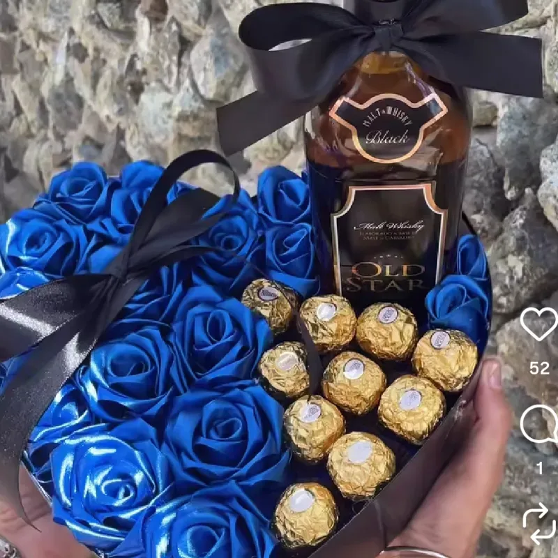 Incluye corazón personalizado con el color de su preferencia Rosas eternas de foami Botella de vino, sidra o ron Bombones (no Ferrero Rocher)