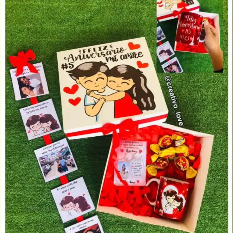 Incluye cajita personalizada a su gusto Con collage de fotos colgantes Una taza personalizada 5 bombones Pareja de llaveros