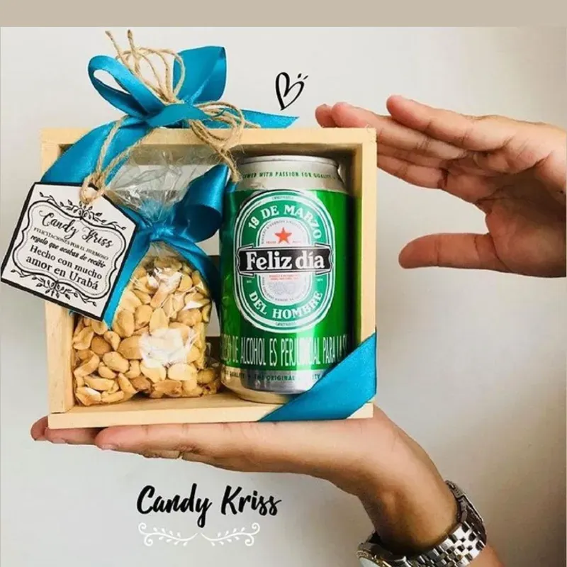 Cajita con decoración de cintas a su elección y tarjeta o foto a su preferencia Incluye Una cerveza, refresco o Malta 4 Confituras variadas