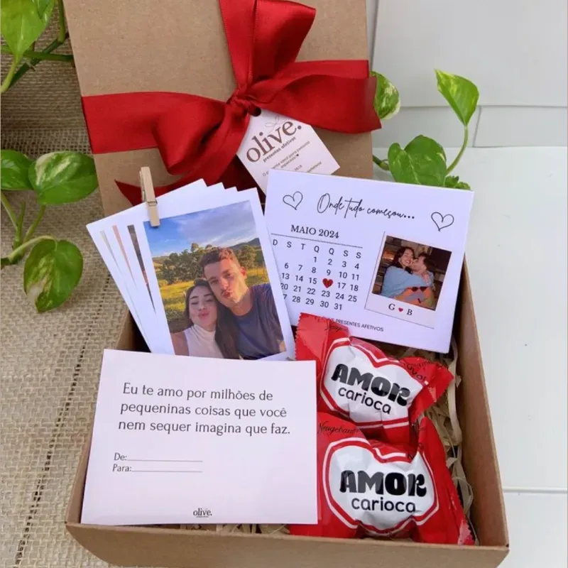 Caja de regalo que incluye: 4 fotos estilo Polaroid Tarjeta personalizada 4 bombones 1 llavero