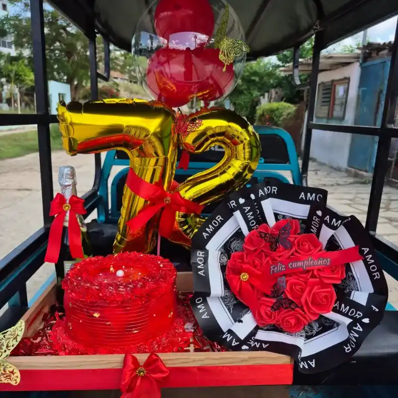 Bandeja con decoracion personalizada a su gusto Globos de números y globo burbuja Cake grande Ramo de 15 rosas eternas Botella de vino, sidra o ron a su preferencia
