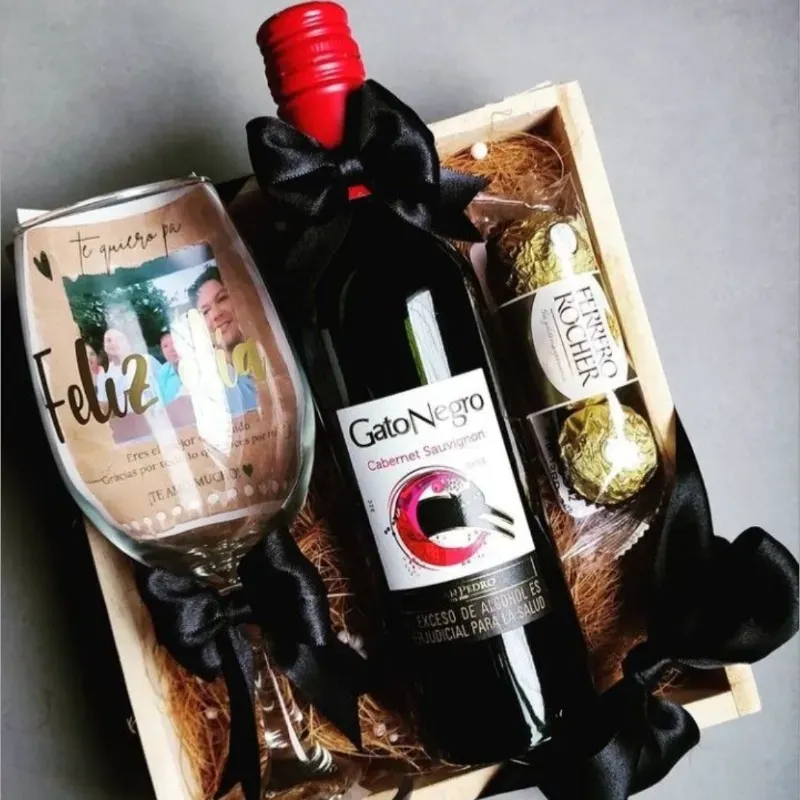 Incluye Botella de vino o sidra Copa de cristal 3 bombones (no Ferrero Rocher) Tarjeta con Foto o frase Cintas decorativas con el color de su preferencia Luces opcional (450cup adicional)