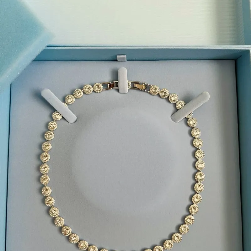 Capturando un aspecto de sofisticación atemporal, este radiante collar Una es una de las siluetas más preciadas de Swarovski. El diseño en tono plateado presenta un borde completo de grandes cristales de corte redondo, cada uno enmarcado por un halo de pavé transparente. El cierre plegable ofrece un cierre perfecto, mientras que el extensor adicional significa que puede ajustar las joyas tanto para la comodidad como para el tamaño. Una manera perfecta de acentuar el glamour en tu estilo de día a noche. *Longitud (mínimo - máximo): 38 - 41 cm *Ancho: 0,8 cm *Material: Cristales y Rodio *Color: Blanco *Tipo de cierre: Doblar sobre el cierre