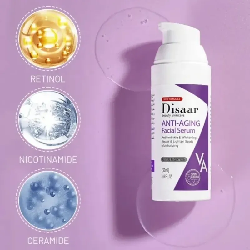 Sérum Facial Dissar Retinol, Niacinamide y Ceramidas. Antiedad, antiarrugas e hidratante. Textura suave sin aceite y absorbible que mejora la nutrición de la piel, combate arrugas, promueve la reparación y regeneración celular. Aumenta la elasticidad para q la piel luzca delicada, hidratada y perfecta. Contiene 50 ML