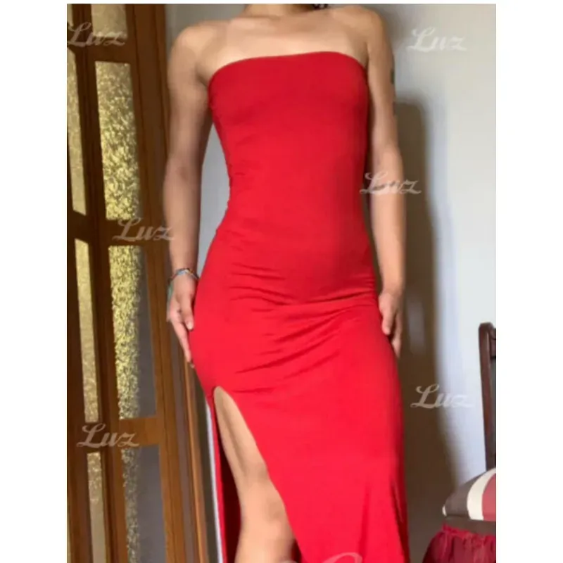 Vestido estilo tope largo con abertura en una pierna color rojo