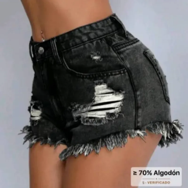 SHEIN PETITE Shorts vaqueros casuales y versátiles para mujer con bolsillos, efecto desgastado y dobladillo deshilachado