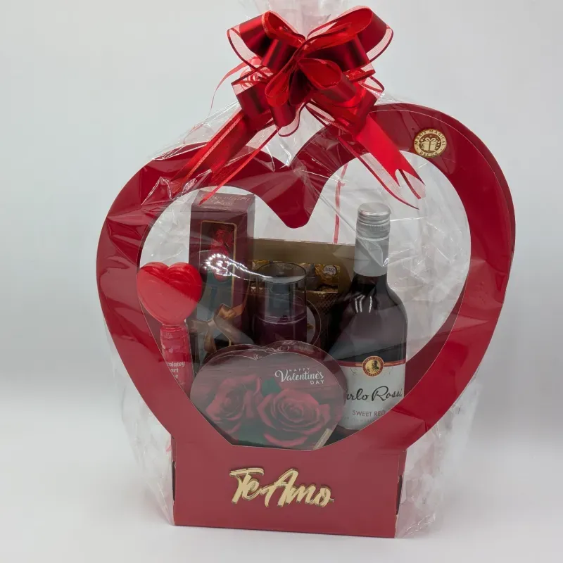 Un regalo lleno de dulzura y elegancia: corazón de chocolate, botella de vino, rosa de chocolate, corazón de dulce, chocolates Ferrero y colonia. Perfecto para sorprender y enamorar.