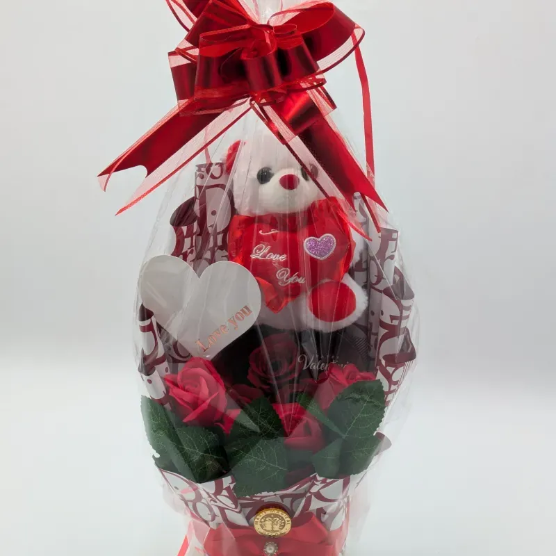 Un detalle dulce y encantador que combina ternura y amor. Incluye un peluche pequeño, chocolates Happy Valentine’s Day y hermosas rosas artificiales, perfecto para sorprender y hacer sonreír a esa persona especial.