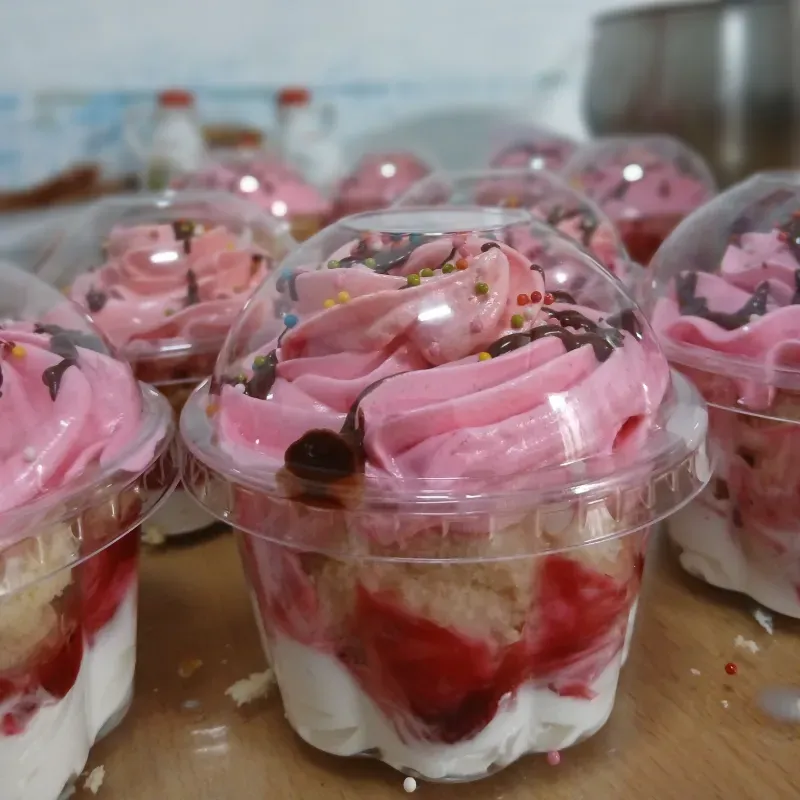 Vaso Domo de 8oz, con jalea sabor frambuesa y panetela 3 leches.