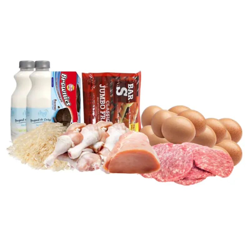 Combo habanero: 6kg de pollo, 2lt de Yogurt Probiótico, 1 paquete de salchichas, 3 paquetes de hamburguesas, 1kg de lomo de cerdo, 30 huevos, 2kg de arroz, 2 leche condensada, 1 caja de brownies.