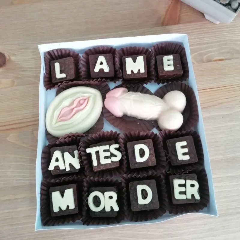 Pene y vulva de chocolate 12 blanco 12 bombones de chocolate oscuro con mensaje.