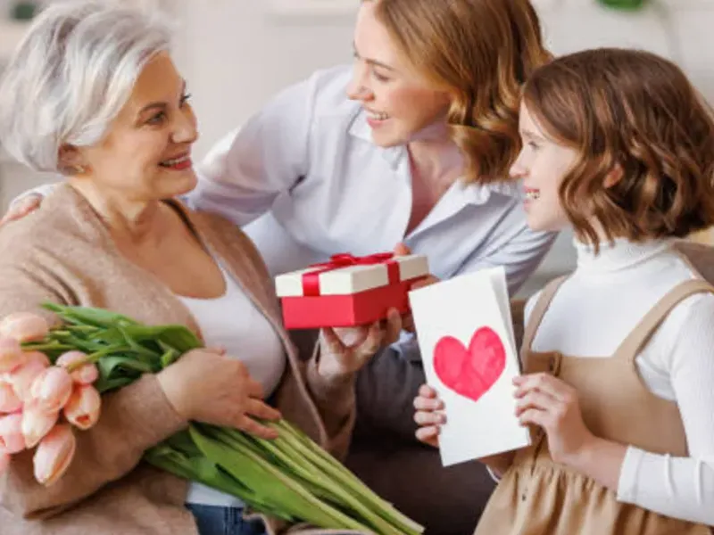 Regalo sofisticado para mamá en caja de madera con asa, presentado con papel creepe, celofán y lazo elegante. Incluye Ruavieja Crema para brindar, copas plásticas, bombones Ferrero y búcaro decorativo con girasol artificial.