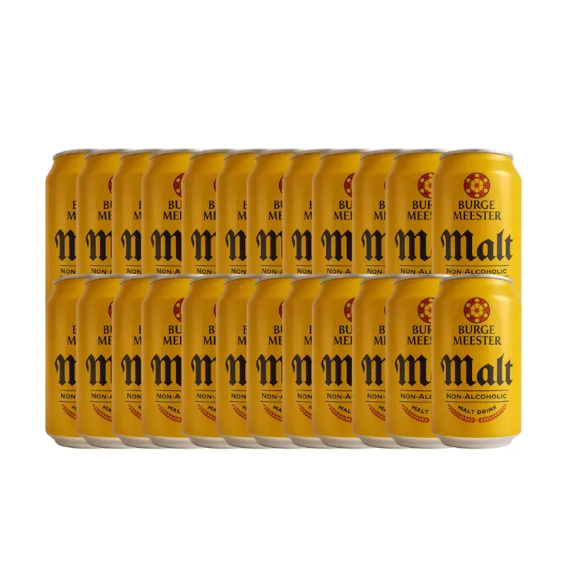 Paquete de 24 unidades de Malta Burge Meester en botella de 330 ml, ideal para venta al por mayor, consumo familiar o negocio. Una bebida refrescante con buena presentación y formato práctico para compartir.