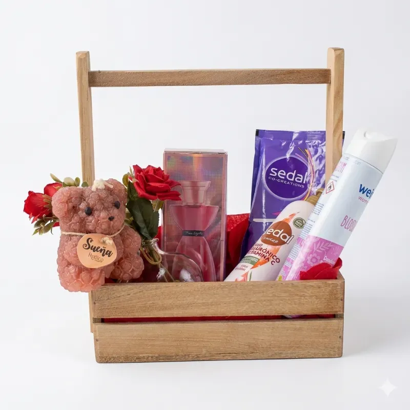 Un detalle especial para mamá, presentado en una caja con asa y decorado con papel celofán transparente, lazo elegante y papel creepe. Incluye productos de cuidado personal, una vela decorativa de oso y un adorno floral en búcaro pequeño para un regalo completo y encantador.
