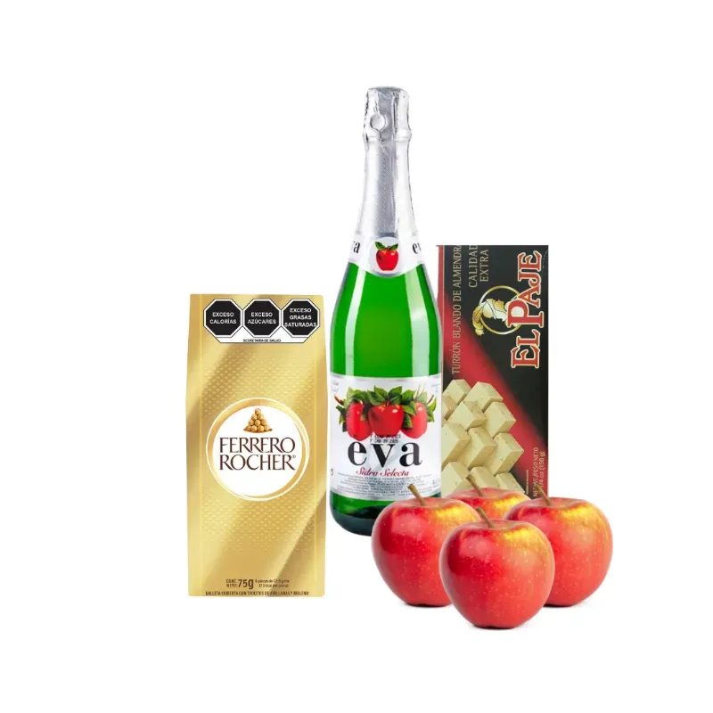Combo Fin de Año #5 ¡El toque dulce perfecto para recibir el Año Nuevo! Este combo #5 está pensado para quienes prefieren el turrón blando y un toque de chocolate en tamaño personal. Incluye Sidra Clásica Eva, 4 manzanas, turrón blando de 150g y una selección de 6 bombones Ferrero Rocher. Ideal para disfrutar en familia, en pareja o como un detalle especial y completo.