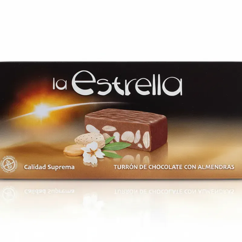 Turrón de Chocolate con Almendras La Estrella 200 gr ¡La deliciosa unión de dos clásicos en uno! El Turrón de Chocolate La Estrella combina un suave y cremoso chocolate con trozos crujientes de almendra tostada entera. En su tableta de 200 gr, este turrón moderno es el favorito de quienes aman el chocolate, ofreciendo un sabor intenso y una textura irresistible. ¡Un imprescindible en tu mesa navideña!
