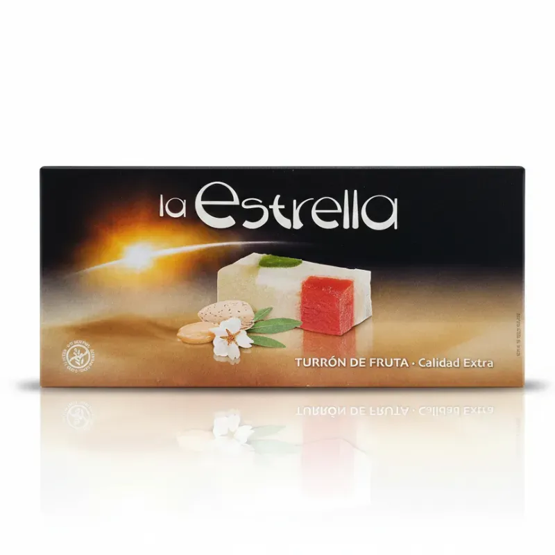 Turrón de Frutas con Almendras La Estrella 200 gr ¡Un estallido de color y sabor en tu mesa navideña! El Turrón de Frutas La Estrella combina la tradicional masa de almendra y miel con un alegre surtido de frutas confitadas (como cereza, calabaza, naranja e higo). En su tableta de 200 gr, es la opción más festiva, dulce y visualmente atractiva, ideal para quienes buscan un turrón diferente y lleno de personalidad.