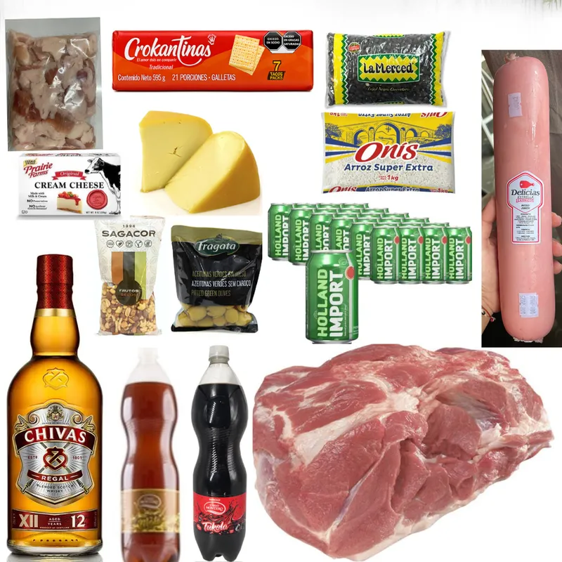 Contiene: 1 paleta de cerdo deshuesada 11-14 lb 2 refrescos 1.5lt 1botella de chivas regal 1jamon Vicky 1.5lb 1 caja de cerveza 24/u 1aceituna 1frutos secos 1arroz 1kg 1frijol negro 500g 1lb de queso gouda 1queso crema 1 galletas crokantinas 7tacos 1lb de empellas de cerdo