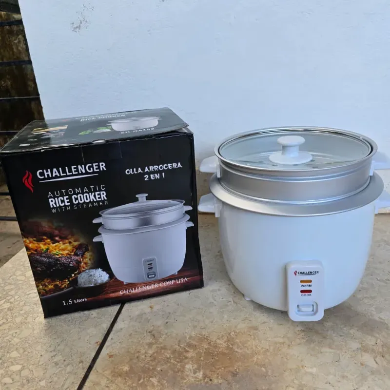 Olla arrocera compacta con función de vaporizador para preparar comidas completas en un solo paso. Ideal para hogares pequeños, estudiantes o cocinas con espacio limitado.