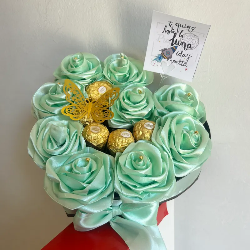 Este corazón dulce incluye 5 bombones y 9 flores (la mariposa va incluida en el precio)