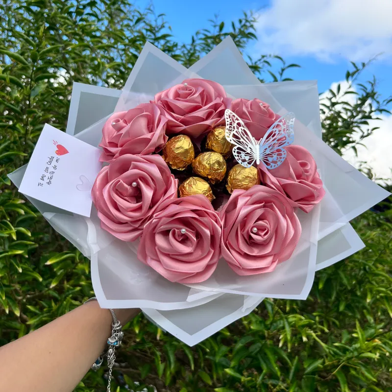 Cada agrego de bombón es $100 Este ramo puedes cambiarle el color de las fotos y el tamaño si lo deseas 🎀 Este ramo cuenta con 7 flores y 5 bombones