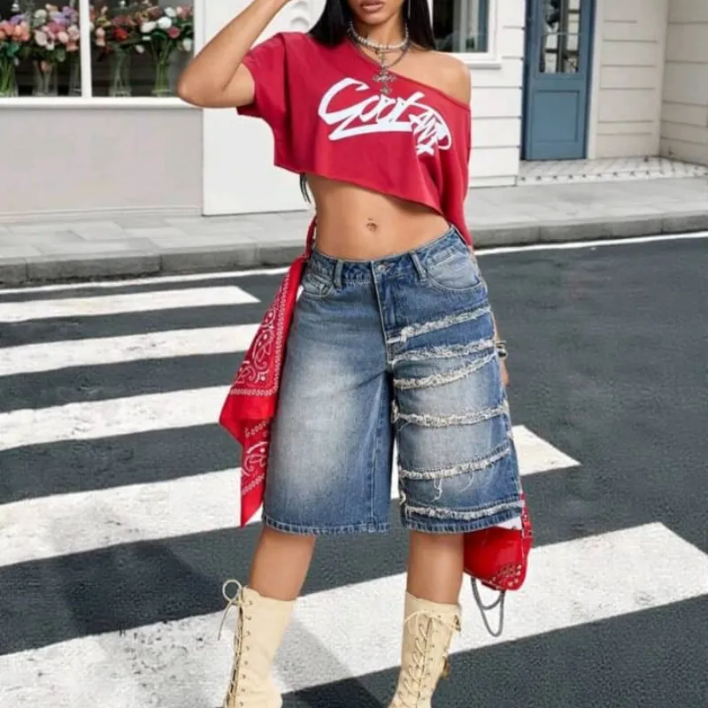 Pantalones cortos de mezclilla holgados para mujer, pantalones cortos de mezclilla de cintura media baja, pantalones cortos de hip-hop Y2K, pantalones cortos de verano