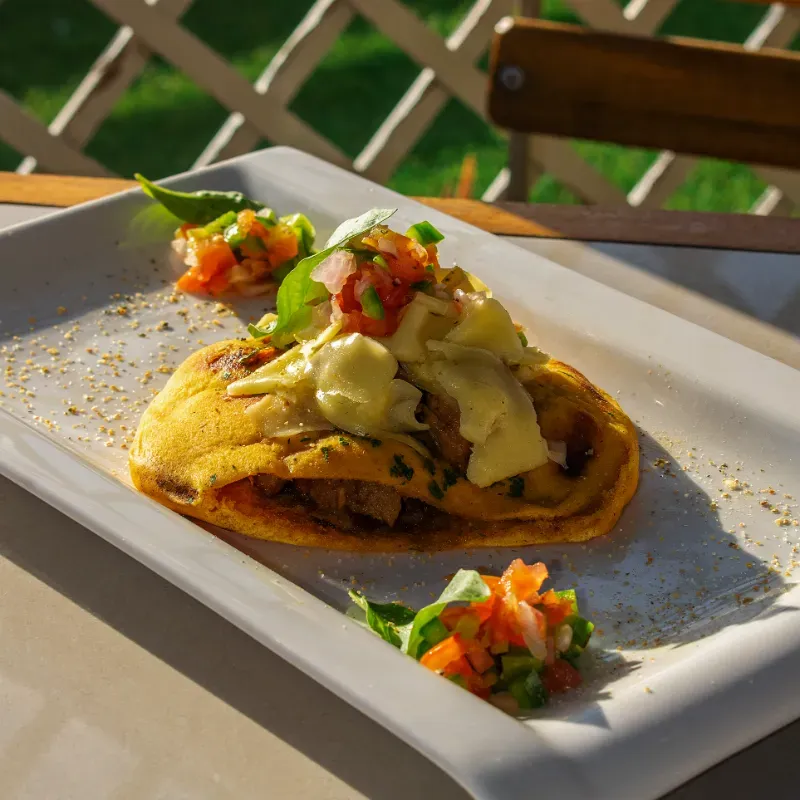Pan plano de origen turco. Relleno de carne de cerdo mechada, vegetales y queso gratinado + 1 extra cdo se sirve.