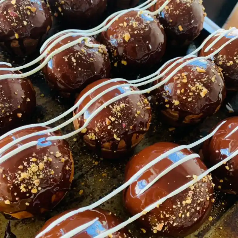Panecillo dulce de chocolate relleno.con crema chiboux de chocolate. Decorado con cobertura y mani