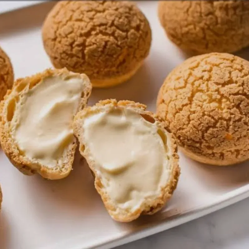 Pasta choux. Relleno de crema pastelera. Cubierto de craquelin de galletas.
