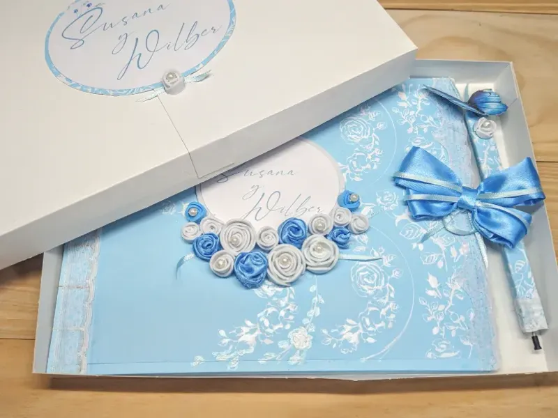 Trae 20-50 hojas lisas o decoradas con un extra paginas decoradas, personalizacion incluida con varias de tonos y gustos y tipografía, en una caja decorada.