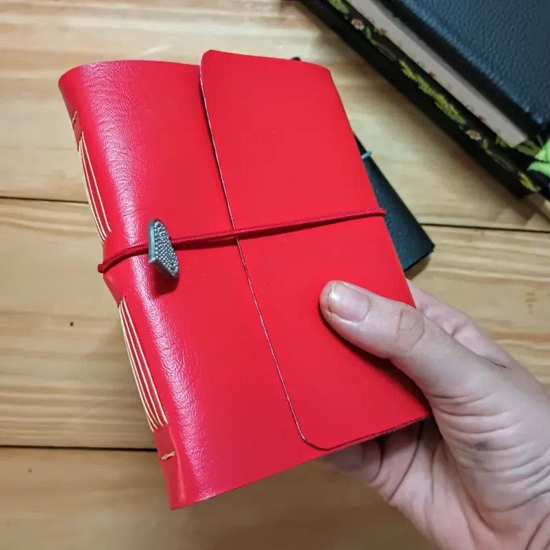 Mini cuaderno de costura expuesta de 100 hojas /200 páginas lisas Con elástico y colgante de corazón Portada de vinil rojo