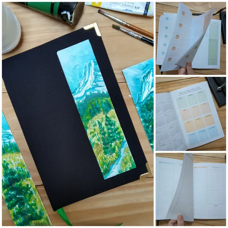 Agenda planner semanal de 80 hojas/160 páginas con portada de tela negra y pintura en acrílico de un prado con esquineros dorados